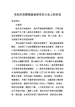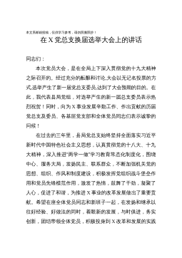 本文系邮箱投稿,仅供学习参考,请勿照搬照抄!在X党总支换届选举大会上的讲话同志们:本次党员大会,是在全局上下深入贯彻党的十九大精神之际召开的。经过充分的酝酿和讨论,大会以无记名投票的方式,选举产生了新一届党总支委员,达到了大会预期的目的。在此,我代表县局党组,对选举产生的新一届总支委员表示热烈祝贺!同时,向为X事业发展辛勤工作、作出贡献的历届党总支及委员、各基层党支部和全体党员同志们表示诚挚的问候!在过去的三年里,县局党总支始终坚持全面落实习近平新时代中国特色社会主义思想,认真贯彻党的十八大、十九大精神,深入推进“两学一做”学习教育常态化制度化,围绕中心、服务大局,发扬民主、联系群众,不断加强...