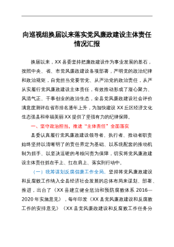 向巡视组换届以来落实党风廉政建设主体责任情况汇报换届以来,XX县委坚持把廉政建设作为事业发展的基石,按照中央、省、市党风廉政建设各项部署,严明党的政治纪律和政治规矩,自觉担当党要管党、从严治党的政治责任,从严从实履行党风廉政建设主体责任,有效推动形成了凝心聚力、风清气正、干事创业的政治生态,全县党风廉政建设社会评价满意度测评在省市排名逐年上升,为加快建设XX丘区经济文化生态强县和幸福美丽XX提供了坚强有力的纪律保障。一、坚守政治担当,推进“主体责任”全面落实县委认真履行党风廉政建设领导者、执行者、推动者职责始终坚持以清晰明了的责任界定为基础、以系统配套的推动机制为抓手、以坚决逗硬的考核问责为保...