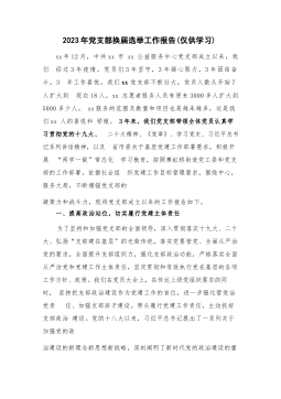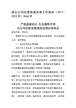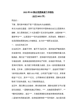 2022年国企党委换届工作报告同志们:下面,我代表中国共产党xx委员会向大会做报告。本次大会的主题是:高举习近平新时代中国特色社会主义思想伟大旗帜,深入贯彻党的二十大及省委十五次党代会精神,全面对标xx、服务争当xx,认真落实xx党代会部署要求,踔厉奋发、勇毅前行,在高质量发展新征程上行稳致远,全力向xx领军企业迈进。一、过去五年的工作过去的五年,是极不寻常、极不平凡的五年。面对复杂严峻的国内外发展环境,特别是新冠肺炎全球大流行、中美经贸摩擦等重大风险挑战,我们在xx的坚强领导下,坚持稳中求进总基调,坚持党建引领促发展,统筹推进疫情防控和生产经营,在危机中育先机、于变局中开新局,各方面工作取得...