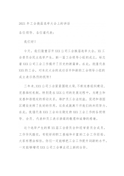 2021年工会换届选举大会上的讲话各位领导、各位谨代表:我们好!今天,我们隆重召开XXX公司工会换届选举大会,XX工会委员会民主选举产生。新一届工会领导小组的成立,标志着XXX公司工会工作揭开了历史的新篇章。在此,我谨代表XXX的工会,对本次大会的成功召开和新的工会领导小组的成立表示热烈的祝贺!三年来,XXX公司工会紧紧围绕大局,不断完善组织建设,完善维权机制。特别是在XXX公司的发展过程中,为建立和完善和谐稳定的劳动关系,维护员工合法权益,促进和谐园区建设发挥了良好的作用。这些成就离不开我们的共同努力。在此,我谨代表XXX工会向长期支持XXX工会工作的各级领导、会员、代表和员工表示崇高的敬意...