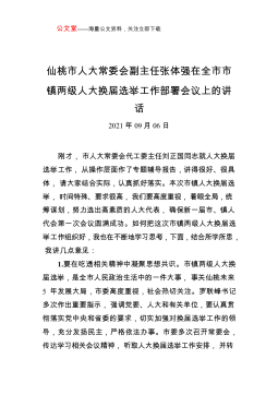 公文堂——海量公文资料,关注立即下载仙桃市人大常委会副主任张体强在全市市镇两级人大换届选举工作部署会议上的讲话2021年09月06日刚才,市人大常委会代工委主任刘正国同志就人大换届选举工作,从操作层面作了专题辅导报告,讲得很好、很具体,请大家结合实际,认真抓好落实。本次市镇人大换届选举,时间特殊、要求很高,我们要高度重视,着眼全局,统筹谋划,努力选出高素质的人大代表,确保新一届市、镇人代会第一次会议圆满成功。如何把这次市镇两级人大换届选举工作组织好,我也在不断地学习思考,下面,结合所学所思,我讲几点意见:1.要在吃透相关精神中凝聚思想共识。市镇两级人大换届选举,是全市人民政治生活中的一件大事,...