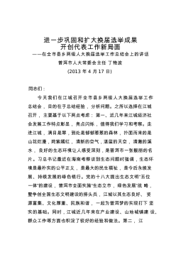 进一步巩固和扩大换届选举成果开创代表工作新局面——在全市县乡两级人大换届选举工作总结会上的讲话普洱市人大常委会主任丁艳波(2013年4月17日)同志们:今天我们在江城召开全市县乡两级人大换届选举工作总结会,目的在于总结经验,分析问题。之所以选择在江城召开,主要基于以下两点考虑:第一、近几年来江城经济社会发展工作特点彰显,亮点闪烁,值得我们学习和考察。走进江城,满目是翠,到处是郁郁葱葱的森林,扑面而来的是山花烂漫,姹紫嫣红,清新的空气,湛蓝的天空,清澈的溪水,良好的生态环境让人感受深刻,是普洱市一张靓丽的名片。习总书记最近在海南考察谈到生态问题时强调,生态环境是最朴实的公平正义,是最大的民生福祉...