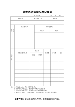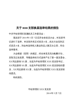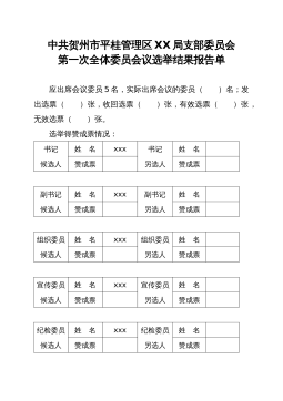 中共贺州市平桂管理区XX局支部委员会第一次全体委员会议选举结果报告单应出席会议委员5名,实际出席会议的委员( )名;发出选票( )张,收回选票( )张,有效选票( )张,无效选票( )张。选举得赞成票情况:书记候选人姓 名xxx书记另选人姓 名赞成票赞成票副书记候选人姓 名xxx副书记另选人姓 名赞成票赞成票组织委员候选人姓 名xxx组织委员另选人姓 名赞成票赞成票宣传委员候选人姓 名xxx宣传委员另选人姓 名赞成票赞成票纪检委员候选人姓 名xxx纪检委员另选人姓 名赞成票赞成票选举结果:同志当选为中国共产党贺州市平桂管理区XX局支部委员会书记,同志当选为中国共产党贺州市平桂管理区X...