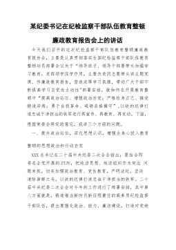 某纪委书记在纪检监察干部队伍教育整顿廉政教育报告会上的讲话今天我们召开的这次纪检监察干部队伍教育整顿廉政教育报告会,主要是认真贯彻落实全国纪检监察干部队伍教育整顿动员部署会议关于“领导班子、领导干部要带头加强学习教育,发挥领学促学作用,主要负责同志要带头讲主题党课、作廉政教育报告,营造浓厚学习氛围,带动广大干部不断提高学习自觉性主动性"部署安排,就如何在开展教育整顿中“提高政治站位、增强政治自觉;严格检身正己、接受锻造淬炼;勇于自我革命、砥砺品格操守”,以铁的纪律打造忠诚干净担当的铁军进行再宣传、再教育、再发动。下面,根据常委会研究的意见,我讲三个方面的问题。一、提升政治站位,深化思想认识,增...