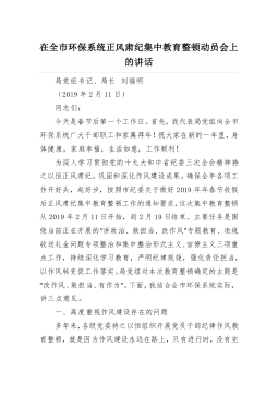 在全市环保系统正风肃纪集中教育整顿动员会上的讲话局党组书记、局长刘福明(2019年2月11日)同志们:今天是春节后第一个工作日。首先,我代表局党组向全市环保系统广大干部职工和家属拜年!祝大家在新的一年里,身体健康,家庭幸福,生活如意,工作顺利!为深入学习贯彻党的十九大和中省纪委三次全会精神持之以恒正风肃纪,巩固和深化作风建设成果,确保全年各项工作开好头,起好步,按照市纪委关于做好2019年年春节收假后正风肃纪集中教育整顿工作的通知要求,这次集中教育整顿从2019年2月11日开始,到2月19日结束。主要任务是围绕当前正在开展的“讲政治、敢担当、改作风”专题教育、违规收送礼金问题专项整治和集中整治...