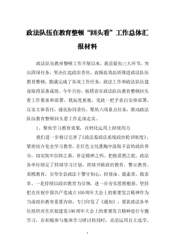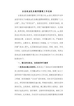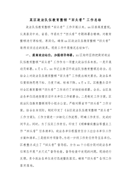 某区政法队伍教育整顿工作总结汇报暨学习教育环节总结效果评估材料按照中央决策部署和省委统一安排,在省ZXX指导组的精心指导下,某区坚持把XX作为当前重大政治任务和区委首要政治责任,以高度的政治自觉法治自觉,认真抓好抓紧抓实XX工作,始终坚持主体责任,系统周密研究谋划、统一凝聚思想共识,为经济发展营造营商环境,树牢以企为本思想,着力保障企业和企业家合法权利,依法保障企业正常生产,为建设对外开放新高地,提供优质高效的XX服务。一、守初心,铸忠诚,统筹部署方向明始终把党性教育作为XX改造主观世界的终身课题,让XX坚定理想信念,秉持高尚道德,恪守纪律法规,弘扬优良传统,用初心使命锤炼忠诚干净担当的政治品...