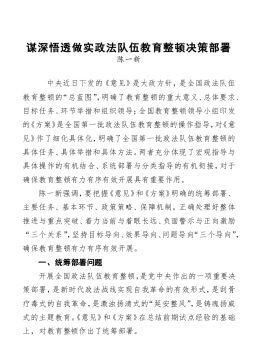 政法教育整顿汇报:精准谋划切实把政法队伍教育整顿落到实处(人民法院党组书记、院长)开展政法队伍教育整顿,是党中央作出的一项重大战略部署,是政法系统一次“刮骨疗毒”式的自我革命,也是一场要坚决打赢的“攻坚仗”“民心仗”。对于这项政治任务,我们精准谋划,从思想上高度统一、行动上高度自觉、落实上高度有力,以加强组织领导促进落实、依靠群众力量赢得民心,紧盯目标、狠抓落实,攻坚克难、持续发力,确保上级要求和部署落地落实,蹄疾步稳推进教育整顿健康有序发展。强化政治认识,部署教育整顿从快从严。切实提高政治站位和责任担当,将学习教育贯穿教育整顿工作全过程。在队伍教育整顿工作启动前,我们通过党组扩大会、工作部署...