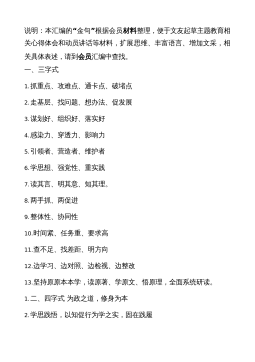 “”说明:本汇编的金句根据会员材料整理,便于文友起草主题教育相关心得体会和动员讲话等材料,扩展思维、丰富语言、增加文采,相关具体表述,请到会员汇编中查找。一、三字式1.抓重点、攻难点、通卡点、破堵点2.走基层、找问题、想办法、促发展3.谋划好、组织好、落实好4.感染力、穿透力、影响力5.引领者、营造者、维护者6.学思想、强党性、重实践7.读其言、明其意、知其理。8.两手抓、两促进9.整体性、协同性10.时间紧、任务重、要求高11.查不足、找差距、明方向12.边学习、边对照、边检视、边整改13.坚持原原本本学,读原著、学原文、悟原理,全面系统研读。1.二、四字式为政之道,修身为本2.学思践悟,以...