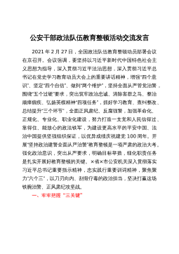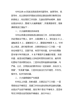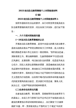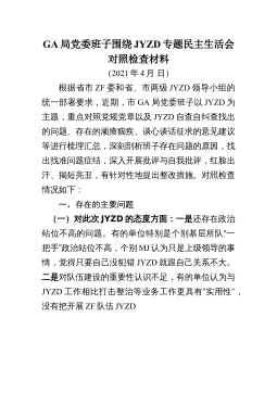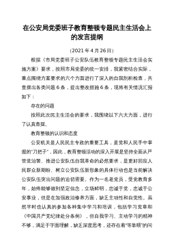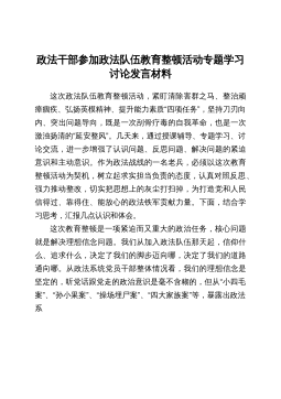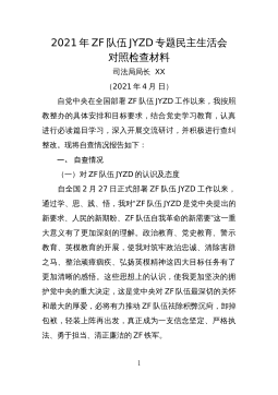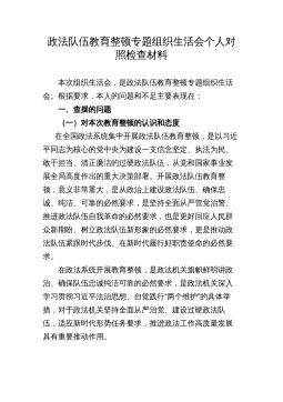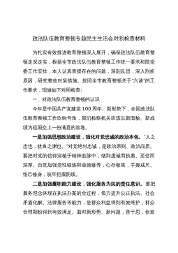 政法队伍教育整顿专题民主生活会对照检查材料 为扎实有效推进教育整顿深入展开,确保政法队伍教育整顿走深走实,根据全市政法队伍教育整顿工作统一要求和院党委工作安排,本人认真查摆存在的问题,深刻反思,深入剖析原因,研究整改对策措施。按照全市教育整顿关于“六谈”的工作要求,现做如下对照检查:一、对政法队伍教育整顿的认识今年是中国共产党建党100周年。新形势下,全国政法队伍教育整顿工作吹响号角,我们检察机关应该以新面貌、新成绩为祖国交上一份满意的答卷。一是加强思想政治建设,强化对党忠诚的政治本色。“人之忠也,犹鱼之渊也。”对党绝对忠诚,是政治原则、政治品质。要把对党的信仰深植于精神血脉中,做到虔诚而执...