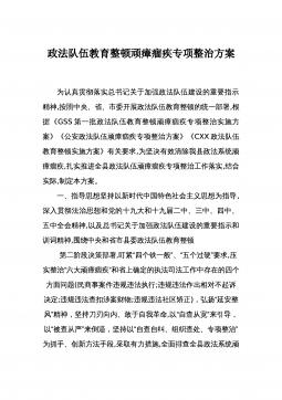 政法队伍教育整顿顽瘴痼疾专项整治方案为认真贯彻落实总书记关于加强政法队伍建设的重要指示精神,按照中央、省、市委开展政法队伍教育整顿的统一部署,根据《GSS第一批政法队伍教育整顿顽瘴痼疾专项整治实施方案》《公安政法队伍顽瘴痼疾专项整治方案》《CXX政法队伍教育整顿实施方案》有关要求,为坚决有效清除我县政法系统顽瘴痼疾,扎实推进全县政法队伍顽瘴痼疾专项整治工作落实,结合实际,制定本方案。一、指导思想坚持以新时代中国特色社会主义思想为指导,深入贯彻法治思想和党的十九大和十九届二中、三中、四中、五中全会精神,以及总书记关于加强政法队伍建设的重要指示和训词精神,围绕中央和省市县委政法队伍教育整顿第二阶段...