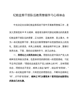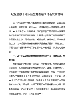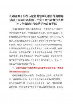 纪检监察干部队伍教育整顿学习教育专题辅导讲稿:练就过硬本领,用实干笃行诠释担当精神,争做新时代优秀纪检监察干部开展纪检监察干部队伍教育整顿是一次思想政治的“照镜子”、党性觉悟的“大体检”、纪律作风的“再出发”。本次专题辅导,是纪检监察系统学习宣传贯彻党的XX大精神的一次具体行动,也是深入开展纪检监察干部队伍教育整顿学习教育环节的一项工作安排。通过本次专题辅导,我们要充分认识开展教育整顿是加强纪检监察干部队伍建设的重要契机,在学习中领悟、在领悟中实践、在实践中探索,切实增强责任感使命感,牢记“三个务必”要求,把工作交给自己,把自己交给组织,在攻坚战持久战中始终冲锋在最前面,当好党和人民的忠诚卫士...