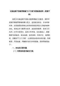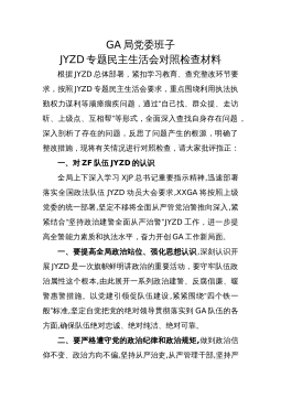 GA局党委班子JYZD专题民主生活会对照检查材料根据JYZD总体部署,紧扣学习教育、查究整改环节要求,按照JYZD专题民主生活会要求,重点围绕利用执法执勤权力谋利等顽瘴痼疾问题,通过“自己找、群众提、走访听、上级点、互相帮”等形式,全面深入查找自身存在问题,深入剖析了存在的问题,反思了问题产生的根源,明确了整改措施,现将有关情况进行对照检查,请大家批评指正:一、对ZF队伍JYZD的认识全局上下深入学习XJP总书记重要指示精神,迅速部署落实全国政法队伍JYZD动员大会要求,XXGA将按照上级党委的统一部署,坚定不移将全面从严管党治警推向深入,紧紧结合“坚持政治建警全面从严治警”JYZD工作,进一...