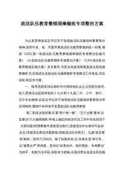 政法队伍教育整顿顽瘴痼疾专项整治方案为认真贯彻落实总书记关于加强政法队伍建设的重要指示精神,按照中央、省、市委开展政法队伍教育整顿的统一部署,根据《GSS第一批政法队伍教育整顿顽瘴痼疾专项整治实施方案》《公安政法队伍顽瘴痼疾专项整治方案》《CXX政法队伍教育整顿实施方案》有关要求,为坚决有效清除我县政法系统顽瘴痼疾,扎实推进全县政法队伍顽瘴痼疾专项整治工作落实,结合实际,制定本方案。一、指导思想坚持以新时代中国特色社会主义思想为指导,深入贯彻法治思想和党的十九大和十九届二中、三中、四中、五中全会精神,以及总书记关于加强政法队伍建设的重要指示和训词精神,围绕中央和省市县委政法队伍教育整顿第二阶段...