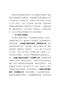 政法队伍教育整顿单位自查自纠报告(司法局、检察院)政法队伍教育整顿单位自查自纠司法局篇自开展队伍教育整顿以来,我局深入贯彻习近平法治思想,认真学习习近平总书记关于加强政法队伍建设的重要指示和训词精神,贯彻落实中央、省委、市委、县委和司法部、省司法厅、市司法局关于开展政法队伍教育整顿的决策部署,扎实推进司法行政系统队伍教育整顿,努力打造一支信念坚定、执法为民、敢于担当、清正廉洁的司法行政队伍。现将教育整顿工作开展情况汇报如下:局党组高度重视司法行政队伍教育整顿工作,坚持在深入动员发动上下功夫,在统一思想认识上见成效。一是3月x日上午,召开县司法行政队伍教育整顿动员部署会,局党组书记、局长x同志在...