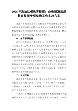 202x年政法队伍教育整顿:公安局派出所教育整顿专项整治工作实施方案为深入贯彻落实上级公安机关坚持政治建警全面从严治警教育整顿部署,按照*公安局坚持政治建警全面从严治警教育整顿工作方案的要求,决定开展严格执法监督、整治执法突出问题专项活动,具体方案如下。一、指导思想坚持以习近平新时代中国特色社会主义思想、党的十九大和十九届二中、三中、四中全会以及十九届中央纪委四次全会精神为指导,认真贯彻落实习近平总书记关于新时代政法工作、公安工作重要指示精神,认真贯彻落实《中共中央关于加强党的政治建设的意见》和全国、全区、全市、全旗公安工作会议精神,坚持政治建警全面从严治警,加强执法监督,整治执法领域突出问题...