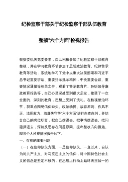 纪检监察干部关于纪检监察干部队伍教育整顿“六个方面”检视报告根据委机关党委要求,自己积极参加了纪检监察干部教育整顿,并在学习教育环节参加了思想政治教育、纪律警示教育等活动,系统地学习了党中央重大决策部署和习近平总书记重要讲话、重要指示批示精神,中央重要会议、重要情况通报等相关文件,观看了警示教育片、聆听领导廉政教育报告等,自己心灵深处受到很大启发,接受了一次全面的、深刻的教育,思想上受到了洗礼。在检视整治环节,我重点围绕信仰缺失、政治动摇、放弃原则、作风不正、滥用权力、清廉失守等“六个方面”进行自查自纠,并结合自己的岗位职责,把自己摆进去、把事情摆进去、把问题摆进去,深刻反思存在问题原因、提出...