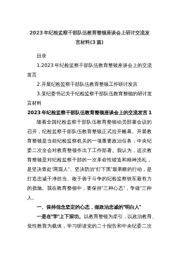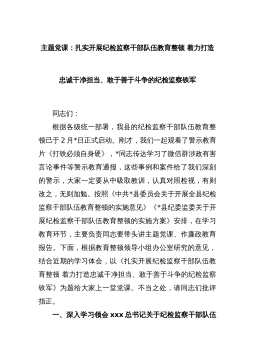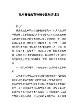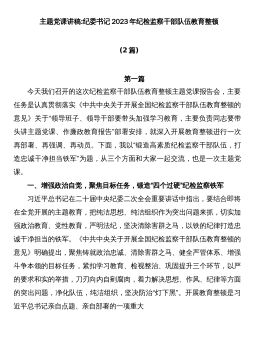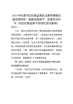 2023年纪委书记纪检监察队伍教育整顿主题党课讲稿:砥砺品格操守,彰显担当作为(结合纪检监察干部违纪违法案例)同志们:今天,我们在这里举办第一期纪检监察队伍教育整顿专题培训班,主要有两个目的,一是借这个机会对教育整顿工作进行再动员再部署,进一步强化思想认识,二是由我给大家上一堂党课,以这个形式进行廉政集体约谈,讲述一些纪检监察干部违纪违法案例,为大家拒腐防变的堤坝培土固堤。下面,我给大家分享“砥砺品格操守,彰显担当作为”的主题党课,希望大家能够有所收获,有所启发。今天的内容,我想通过三个方面展开来说。第一部分,我想说一说关于加强纪检监察干部队伍建设的重要性和紧迫性***以来,习近平总书记在每一...