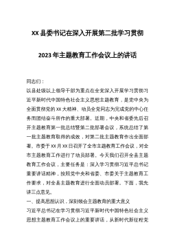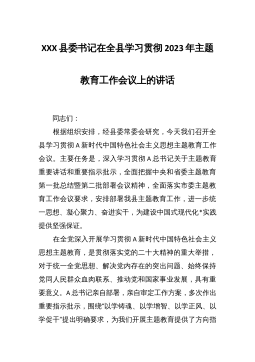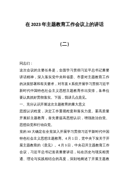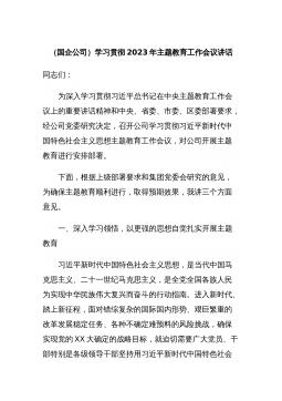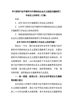 学习贯彻习近平新时代中国特色社会主义思想主题教育工作会议上的讲话(汇编)目录:1、全市2023年主题教育工作会议上的讲话2、公司学习贯彻习近平新时代中国特色社会主义思想主题教育工作会议上的动员讲话3、高校巡回指导组在学习贯彻习近平新时代中国特色社会主义思想主题教育巡回指导工作培训会议上的讲话全市2023年主题教育工作会议上的讲话篇一同志们:今天,我们在这里召开全市学习贯彻习近平新时代中国特色社会主义思想主题教育工作会议,主要任务是深入贯彻落实中央精神,对全市开展学习贯彻习近平新时代中国特色社会主义思想主题教育进行全面动员,作出部署安排。刚才,xxx同志领学了中央关于开展学习贯彻习近平新时代中国...