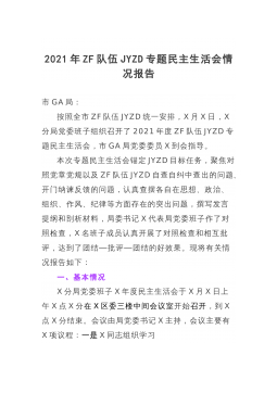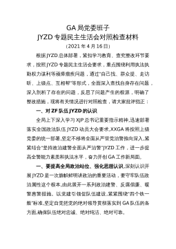 GA局党委班子JYZD专题民主生活会对照检查材料(2021年4月16日)根据JYZD总体部署,紧扣学习教育、查究整改环节要求,按照JYZD专题民主生活会要求,重点围绕利用执法执勤权力谋利等顽瘴痼疾问题,通过“自己找、群众提、走访听、上级点、互相帮”等形式,全面深入查找自身存在问题,深入剖析了存在的问题,反思了问题产生的根源,明确了整改措施,现将有关情况进行对照检查,请大家批评指正:一、对ZF队伍JYZD的认识全局上下深入学习XJP总书记重要指示精神,迅速部署落实全国政法队伍JYZD动员大会要求,XXGA将按照上级党委的统一部署,坚定不移将全面从严管党治警推向深入,紧紧结合“坚持政治建警全面从严...