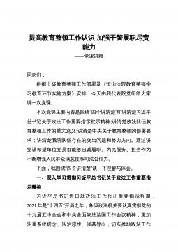 纪检监察干部队伍教育整顿学习教育专题辅导讲稿:练就过硬本领,用实干笃行诠释担当精神,争做新时代优秀纪检监察干部开展纪检监察干部队伍教育整顿是一次思想政治的“照镜子”、党性觉悟的“大体检”、纪律作风的“再出发”。本次专题辅导,是纪检监察系统学习宣传贯彻党的XX大精神的一次具体行动,也是深入开展纪检监察干部队伍教育整顿学习教育环节的一项工作安排。通过本次专题辅导,我们要充分认识开展教育整顿是加强纪检监察干部队伍建设的重要契机,在学习中领悟、在领悟中实践、在实践中探索,切实增强责任感使命感,牢记“三个务必”要求,把工作交给自己,把自己交给组织,在攻坚战持久战中始终冲锋在最前面,当好党和人民的忠诚卫士...