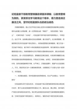 纪检监察干部教育整顿廉政课堂讲课稿:以教育整顿为契机,紧紧抓住学习教育这个根本,着力塑造清正廉洁之风,坚守纪检监察队伍的政治底色开展教育整顿,是以习近平同志为核心的党中央着眼党和国家事业发展全局作出的重大决策部署,是一次思想政治的“照镜子”、党性觉悟的“掸灰尘”、纪律作风的“大体检”。纪检监察干部不能只拿手电筒照别人,不照自己。自己干净、自身廉洁是执纪执法者最硬、最大的底气。此次教育整顿,把基层单位机关纪检监察干部全员纳入,目的就是要通过教育整顿,着力打造一支忠诚干净担当、敢于善于斗争的高素质纪检监察铁军。我们要深刻认识教育整顿的重大意义,将教育整顿与正在开展的主题教育结合起来,通过自觉接受政...