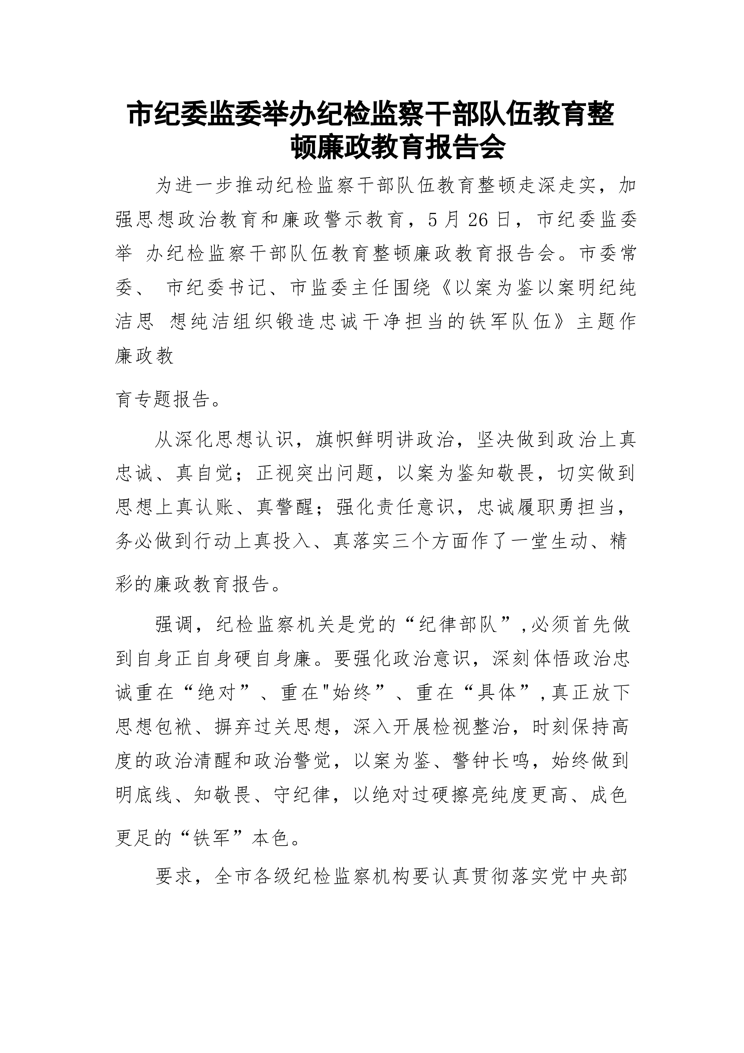 市纪委监委举办纪检监察干部队伍教育整顿廉政教育报告会为进一步推动纪检监察干部队伍教育整顿走深走实,加强思想政治教育和廉政警示教育,5月26日,市纪委监委举办纪检监察干部队伍教育整顿廉政教育报告会。市委常委、市纪委书记、市监委主任围绕《以案为鉴以案明纪纯洁思想纯洁组织锻造忠诚干净担当的铁军队伍》主题作廉政教育专题报告。从深化思想认识,旗帜鲜明讲政治,坚决做到政治上真忠诚、真自觉;正视突出问题,以案为鉴知敬畏,切实做到思想上真认账、真警醒;强化责任意识,忠诚履职勇担当,务必做到行动上真投入、真落实三个方面作了一堂生动、精彩的廉政教育报告。强调,纪检监察机关是党的“纪律部队”,必须首先做到自身正自身...