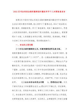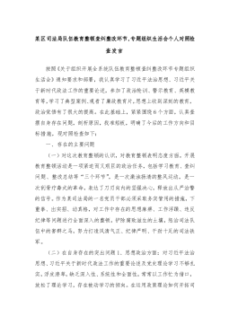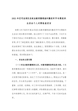 某区司法局队伍教育整顿查纠整改环节,专题组织生活会个人对照检查发言按照《关于组织开展全系统队伍教育整顿查纠整改环节专题组织生活会》通知要求和部署,我认真学习了习近平法治思想、习近平关于新时代政法工作的重要论述,参加了政治轮训、警示教育、英模教育等,学习了典型案例、观看了廉政教育片,思想上收到深刻的教育,政治觉悟有了很大的提高。在此基础上,紧紧围绕6个方面,认真查摆自身存在问题,剖析原因,找准短板,明确了今后的工作方向和目标措施,现对照检查如下:一、存在的主要问题(一)对这次教育整顿的认识,对教育整顿表明态度方面。开展教育整顿活动是一项紧迫而又艰巨的政治任务,包括学习教育、查纠问题、整改总结等“...