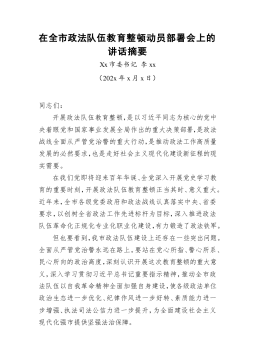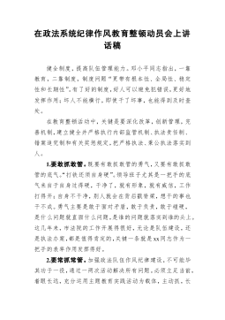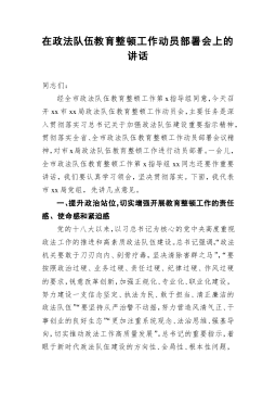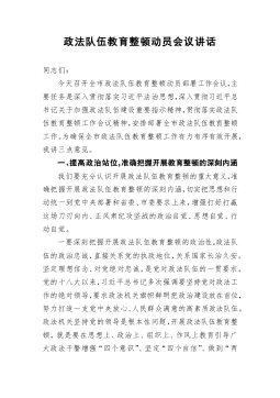 政法委书记202x年在全县政法队伍,教育整顿动员部署会议上的讲话同志们:在我们党即将迎来百年华诞、全党深入开展党史学习教育之际,党中央部署在全国开展政法队伍教育整顿,这是我们党不断加强自身建设的又一重大举措。刚才,省驻点指导组组长xx同志作了很好的讲话,对我们开展政法队伍教育整顿具有重要的指导作用。全县各级各部门尤其是政法系统,一定要认真学习领会xx同志的讲话要求,结合实际抓好贯彻落实。一会儿,县委书记xx同志还将作重要讲话,我们一定认真学习领会、坚定抓好贯彻落实。下面,我就全县深入开展政法队伍教育整顿作如下动员部署。一、提高政治站位,深刻认识开展教育整顿的极端重要性和现实紧迫性近年来,总书记...
