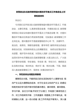 狱警政法队伍教育整顿查纠整改环节重点工作推进会上对照检查材料同志们:今天我们召开政法队伍教育整顿查纠整改环节重点工作推进会,主要任务是,认真贯彻落实省委、市委政法队伍教育整顿领导小组会议和查纠整改环节重点工作推进会精神,对查纠整改环节重点任务进行再安排再部署,切实推动教育整顿工作走深走实。查纠整改环节是教育整顿的中心环节、关键环节,政治性、政策性、策略性都很强,要牢牢把握筑牢政治忠诚这条政治红线,时刻保持政治上的清醒坚定,始终站在落实党中央部署、维护党中央权威、对党和人民群众负责的高度,不断加深对党中央开展政法队伍教育整顿重大意义的认识。广大政法干警学史明理、学史增信、学史崇德、学史力行,确保...