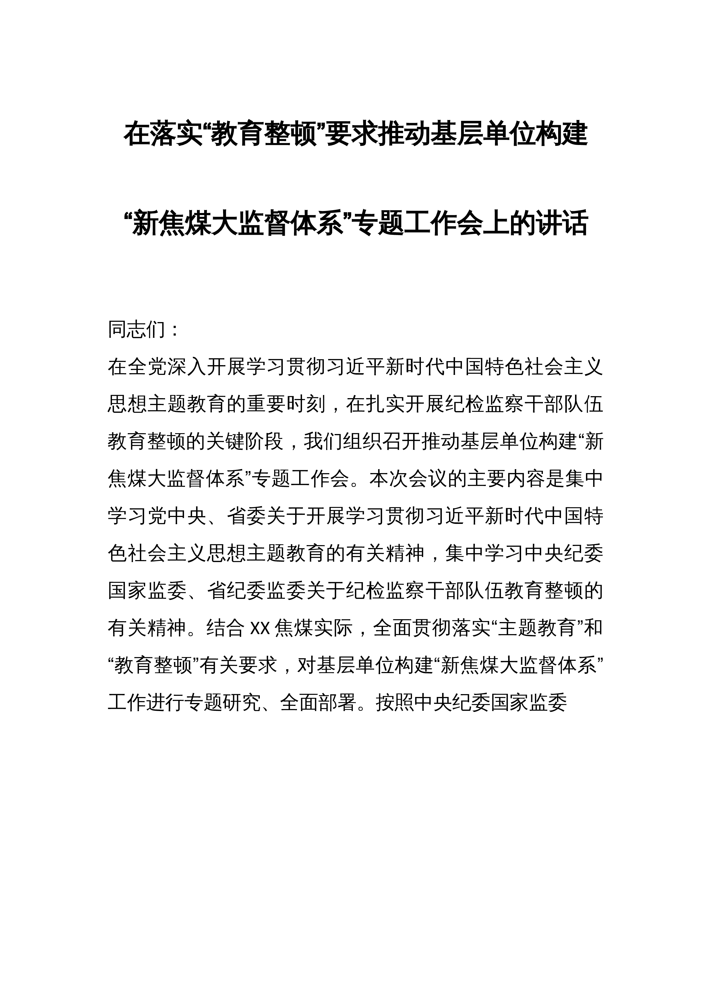 在落实“教育整顿”要求推动基层单位构建“新焦煤大监督体系”专题工作会上的讲话同志们:在全党深入开展学习贯彻习近平新时代中国特色社会主义思想主题教育的重要时刻,在扎实开展纪检监察干部队伍教育整顿的关键阶段,我们组织召开推动基层单位构建“新焦煤大监督体系”专题工作会。本次会议的主要内容是集中学习党中央、省委关于开展学习贯彻习近平新时代中国特色社会主义思想主题教育的有关精神,集中学习中央纪委国家监委、省纪委监委关于纪检监察干部队伍教育整顿的有关精神。结合XX焦煤实际,全面贯彻落实“主题教育”和“教育整顿”有关要求,对基层单位构建“新焦煤大监督体系”工作进行专题研究、全面部署。按照中央纪委国家监委要求...