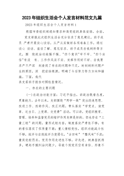 2023年组织生活会个人发言材料范文九篇2023年组织生活会个人发言材料1根据市委组织部通知要求和局党组的具体安排,会前,党支部就此次组织生活会充分征求了意见建议,班子成员严肃开展谈心谈话,从严从实做好各项准备工作,通过谈心谈话、座谈了解、意见征求、班子成员自我剖析等方式,围绕政治功能强不强、"四个意识"牢不牢、"四个自信"有没有、工作作风实不实、发挥作用好不好、自我要求严不严深刻查找了存在的问题和不足,时刻剖析问题产生的原因,深挖症结根源,明确了今后努力努力方向和措施。下面,我代表支委班子报告对照检查情况。一、存在的主要问题(一)在政治功能方面:习近平指出,讲政治既看态度,更靠能力。去年以来...