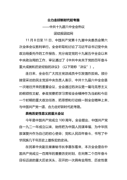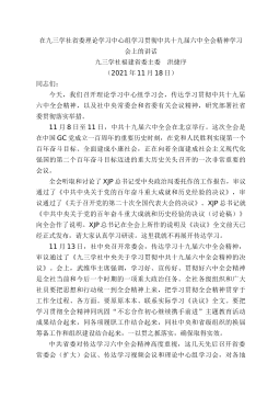 在九三学社省委理论学习中心组学习贯彻中共十九届六中全会精神学习会上的讲话九三学社福建省委主委洪捷序(2021年11月18日)同志们:今天,我们召开理论学习中心组学习会,传达学习贯彻中共十九届六中全会精神,以及社中央常委会和省委有关会议精神,研究部署社省委贯彻落实举措。11月8日至11日,中共十九届六中全会在北京举行。这次全会是在中国GC党成立一百周年的重要历史时刻,在党和人民胜利实现第一个百年奋斗目标、全面建成小康社会,正在向着全面建成社会主义现代化强国的第二个百年奋斗目标迈进的重大历史关头召开的一次非常重要的会议。全会听取和讨论了XJP总书记受中央政治局委托作的工作报告,审议通过了《中共中央...