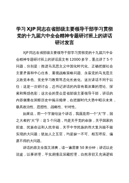 学习XJP同志在省部级主要领导干部学习贯彻党的十九届六中全会精神专题研讨班上的讲话研讨发言XJP同志在省部级主要领导干部学习贯彻党的十九届六中全会精神专题研讨班上的讲话原文有12000多字,重点讲了5个问题,分别是:推进马克思主义中国化时代化、正确把握社会主要矛盾和中心任务、重视战略策略问题、永葆党的马克思主义政党本色、党史学习教育常态化长效化。这次讲话不同于以往:这是一次研讨会,总书记讲话的内容有着浓重的理论、探索和释惑色彩;这次会的受众是省部级主要领导干部,讲话的内容侧重在洞察历史中揭示规律,在把握时代大势中昭示未来,极具政治性、思想性、战略性、针对性。如果说,用一个字凝结这个讲话,我愿意...