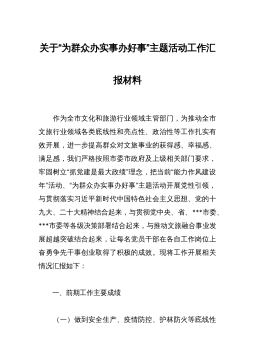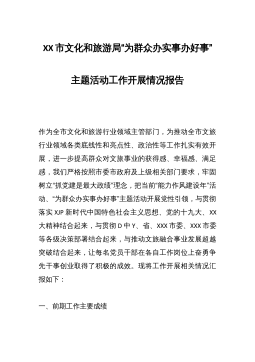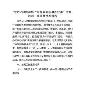 XX市文化和旅游局“为群众办实事办好事”主题活动工作开展情况报告作为全市文化和旅游行业领域主管部门,为推动全市文旅行业领域各类底线性和亮点性、政治性等工作扎实有效开展,进一步提高群众对文旅事业的获得感、幸福感、满足感,我们严格按照市委市政府及上级相关部门要求,牢固树立“抓党建是最大政绩”理念,把当前“能力作风建设年”活动、“为群众办实事办好事”主题活动开展党性引领,与贯彻落实XJP新时代中国特色社会主义思想、党的十九大、XX大精神结合起来,与贯彻D中Y、省、XXX市委、XXX市委等各级决策部署结合起来,与推动文旅融合事业发展超越突破结合起来,让每名党员干部在各自工作岗位上奋勇争先干事创业取得了...