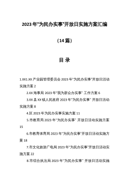 2023年“为民办实事”开放日活动实施方案汇编(16篇)目录1.XX县XX镇2023年“为民办实事”开放日实施方案32.XX综合保税区管理委员会2023年“为民办实事”开放日活动实施方案3.市发展和改革委员会2023年“为民办实事”开放日活动实施方案4.市生态环境局XX分局2023年“开门办实事”开放日实施方案5.市生态环境局XX分局2023年“为民办实事”开放日活动实施方案6.市市政管理局2023年“为民办实事”开放日活动实施方案7.市卫生健康委员会2023年“为民办实事”开放日活动实施方案8.市医疗保障局2023年“为民办实事”开放日活动实施方案9.市应急管理局2023年“开门办实事”开放...