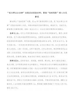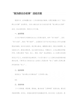 “我为群众办实事”实践活动情况汇报及教育实践活动方案(2篇)目录:篇一:“我为群众办实事”实践活动情况汇报篇二:“我为群众办实事”教育实践活动方案篇一:“我为群众办实事”实践活动情况汇报一、找准“落脚点”,办好群众“急事”。二、理清“连接线”,解决群众“难事”。三、拓宽“服务面”,做好群众“小事”。xx学习教育开展以来,xx县坚持“切口小、发力准、见效快”的原则(思路),聚焦群众“急难愁盼”问题,坚持“点线面”同步发力、“急难小”一体推进(措施),推动“我为群众办实事”实践活动扎实开展,让人民群众见到新气象、更有获得感(开头引言非常精炼,既有思路又有措施更有结果)。一、找准“落脚点”,办好群众...