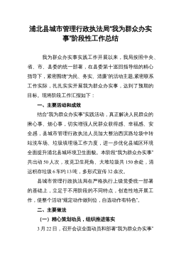 浦北县城市管理行政执法局“我为群众办实事”阶段性工作总结 我为群众办实事实践工作开展以来,我局按照中央、省、市、县委的统一部署,在县委第十巡回指导组的精心指导下,紧密围绕“为民、务实、清廉”的活动主题,紧密联系工作实际,扎扎实实开展我为群众办实事,达到了预期的目标。现将阶段工作汇报如下:一、主要活动和成效结合“我为群众办实事”实践活动,真正解决人民群众的揪心事、烦心事,切实增强人民群众获得感、幸福感、安全感,县城市管理行政执法人员加大整治西滨路垃圾中转站洗车场、垃圾填埋场工作力度,进一步优化县城区环境全面提升浦北县城环境卫生面貌。本阶段“我为群众办实事”共出动50人次,攻克卫生死角、大堆垃...