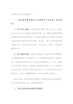 向领导汇报工作的秘诀一、首先我们要知道为什么要进行工作汇报,有必要吗?1、对于自己来说。当然非常有必要!因为这是一个提升自己能力且为自己增加收益的过程。怎么增加收益呢?就是能增加领导面前的存在感,你要知道领导才是你最大的资源,只要你能让领导觉得你有思想、有能力,那么你离升职加薪也就不远了,因此汇报工作是一个好机会,也是一个刷脸的重要方式。2、对于领导来说:能增加可控性。因为每个领导都喜欢任何事情都在自己的掌控之中,这样能增加领导的心理安全感,同时你向领导汇报工作也能让领导把关一下工作,确保工作进展在计划内,少犯错。最后假如发生了工作上的意外或大的失误,在进行汇报时告知领导,可以有时间应对风险的...
