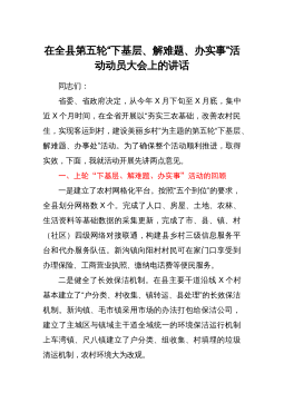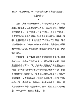 在全市“排忧解难办实事、化解积案促和谐”主题活动动员大会上的讲话XXX现在,大家的任务都很重,归结起来就是两条,一是发展的任务重,二是稳定的任务重;大家都很忙,归结起来也是两条,一是忙发展,二是忙稳定。今天下午的会,主要研究的就是稳定问题。刚才金冬同志对“排忧解难办实事、化解积案促和谐”主题活动作了全面的安排部署,这个活动是根据中央“信访积案化解年”的安排,是市委高度重视的一项重大活动,希望同志们按照金冬同志的部署,认真抓好落实。去年以来,全市各级党委政府和市直有关部门认真落实党中央、省委关于信访稳定的一系列的决策部署,高度重视信访维稳工作,下大力解决人民群众反映强烈的突出问题,多举措化解影响...