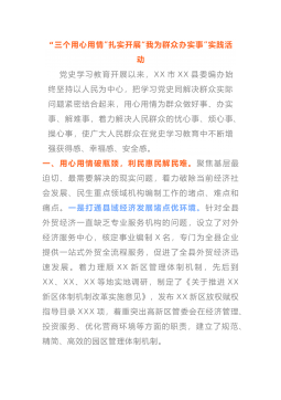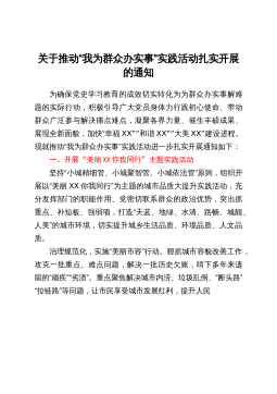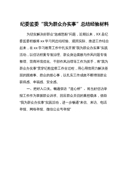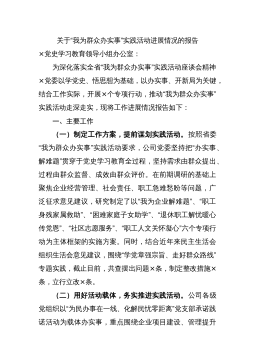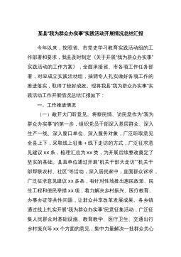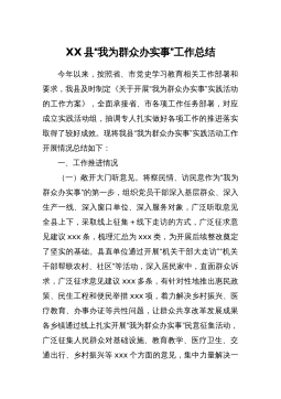 XX县“我为群众办实事”工作总结今年以来,按照省、市党史学习教育相关工作部署和要求,我县及时制定《关于开展“我为群众办实事”实践活动的工作方案》,全面承接省、市各项工作任务部署,对应成立实践活动组,抽调专人扎实做好各项工作的推进落实取得了较好成效。现将我县“我为群众办实事”实践活动工作开展情况总结如下:一、工作推进情况(一)敞开大门听意见。将察民情、访民意作为“我为群众办实事”的第一步,组织党员干部深入基层群众、深入生产一线、深入窗口单位、深入服务对象,广泛听取意见全县上下,采取线上征集+线下走访的方式,广泛征求意见建议xxx条,梳理汇总为xxx类,为开展后续整改奠定了坚实的基础。县直单位通过...