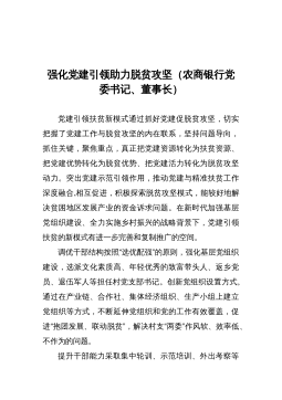强化党建引领助力脱贫攻坚(农商银行党委书记、董事长)党建引领扶贫新模式通过抓好党建促脱贫攻坚,切实把握了党建工作与脱贫攻坚的内在联系,坚持问题导向,抓住关键,聚焦重点,真正把党建资源转化为扶贫资源、把党建优势转化为脱贫优势、把党建活力转化为脱贫攻坚动力。突出党建示范引领作用,推动党建与精准扶贫工作深度融合,相互促进,积极探索脱贫攻坚模式,能较好地解决贫困地区发展产业的资金诉求问题。在新时代加强基层党组织建设、全力实施乡村振兴的战略背景下,党建引领扶贫的新模式有进一步完善和复制推广的空间。调优干部结构按照“选优配强”的原则,强化基层党组织建设,选派文化素质高、年轻优秀的致富带头人、返乡党员、退...