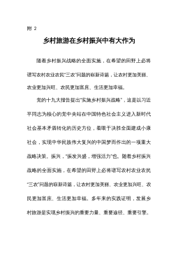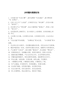 乡村振兴类排比句1.乡村振兴的“红色引擎”,城市治理的“红色堡垒”,新兴群体的“红色驿站”。2.打好三农工作“主动战”,打响现代农业“特色牌”,打造乡村振兴“新标杆”。3.夯实现代产业“硬支撑”,抢占关键领域“智高点”,争做人才招引“排头兵”。4.在巩固成果上持续用力,在乡村振兴上大胆探索,在有效衔接上积极作为。5.以农耕文化为魂,以田园风光为韵,以村落民宅为形,以生态农业为基。6."农业底盘"更加稳固,"品牌效应"更加凸显,"乡村颜值"更加亮眼。7.农业综合实力在提升,农村整体面貌在改观,农民生活水平在提高。8.强县和富民统一起来,改革和发展结合起来,城镇和乡村贯通起来。9.产业筋骨“壮起来...