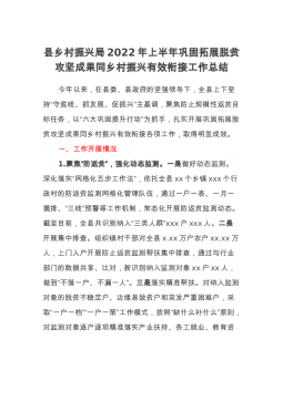 县乡村振兴局2022年上半年巩固拓展脱贫攻坚成果同乡村振兴有效衔接工作总结今年以来,在县委、县政府的坚强领导下,全县上下坚持“守底线、抓发展、促振兴”主基调,聚焦防止规模性返贫目标任务,以“六大巩固提升行动”为抓手,扎实开展巩固拓展脱贫攻坚成果同乡村振兴有效衔接各项工作,取得明显成效。一、工作开展情况1.聚焦“防返贫”,强化动态监测。一是做好动态监测。深化落实“网格化五步工作法”,依托全县xx个乡镇xxx个行政村的防返贫监测网格化管理队伍,通过一户一表、一月一摸排、“三线”预警等工作机制,常态化开展防返贫监测动态。截至目前,全县共识别纳入“三类人群”xxx户xxx人。二是开展集中排查。组织镇村...