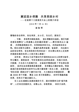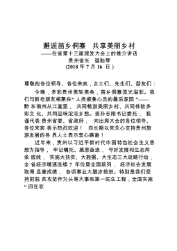 邂逅苗乡侗寨共享美丽乡村——在省第十三届旅发大会上的推介讲话贵州省长谌贻琴(2018年7月16日)尊敬的各位领导、各位来宾,女士们、先生们、朋友们:今晚,多彩贵州美轮美奂,苗乡侗寨流光溢彩。我们与新老朋友相聚在“人类疲惫心灵的最后家园”——黔东南州从江銮里,共同畅游美丽乡村、共同体验多彩文化、共同品味浓浓乡愁。受孙志刚书记委托,我谨代表贵州省委、省政府,向出席大会的各位领导、各位来宾表示热烈欢迎!向长期以来关心支持贵州旅游发展的各界人士表示衷心感谢!近年来,贵州以习近平新时代中国特色社会主义思想为指导,牢记嘱托、感恩奋进,守好发展和生态两条底线,实施大扶贫、大数据、大生态三大战略行动,全省经济...
