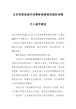 北京将营造城市消费新场景推进国际消费中心城市建设北京市商务局20日发布《北京培育建设国际消费中心城市2024年工作要点》,提出将营造城市消费新场景,持续深入推进北京国际消费中心城市建设取得新进展,稳步提升国际知名度、消费繁荣度、商业活跃度、到达便利度、消费舒适度。 编制实施4个国际消费体验区建设方案 北京将大力推动新商圈建设和老商圈改造提升。编制实施王府井×西单×前门、CB党×三里屯、环球影城×大运河、丽泽×首都商务新区4个国际消费体验区建设方案。依托城市更新,推动西直门、双井等15个左右传统商圈改造升级加快推进老旧商场、体育馆、演出场所、博物馆、展览馆等改造升级。持续优化交通环境、公共环...
