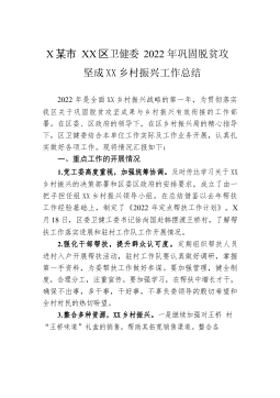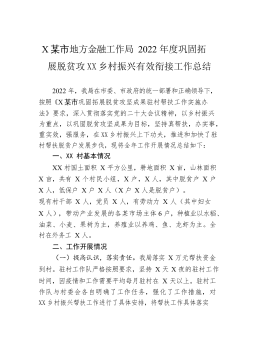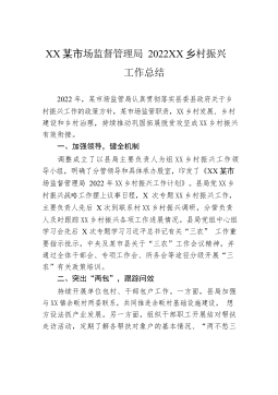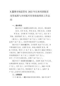 X某市市场监管局2022年以来巩固脱贫攻坚成果与乡村振兴有效衔接帮扶工作总结一、基本情况XX村位于XX区XX镇西北部,紧X区,耕地面积X亩,农田X亩,旱地X亩,林地X亩,水面面积X亩。全村辖X个村民组,X户X人。划分X个网格,安排网格员X人,共有X个公益性岗位,安排就业人数X人。XX村脱贫户X户X人,边缘户X户X人.监测户X户X人。目前所有脱贫困户已全部脱贫。XX村位于XXX镇西部,全村面积X.X平方公里,其中耕地面积X亩,水面积X亩,林地山场面积X亩,辖X个村民组,现有人口X户X人。XX村为2014年建档立卡脱贫村,2017年底顺利实现村出列户脱贫任务,目前国办系统建档脱贫户X户X人(含监测...