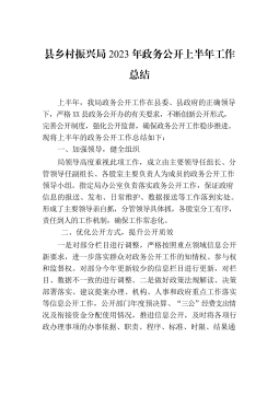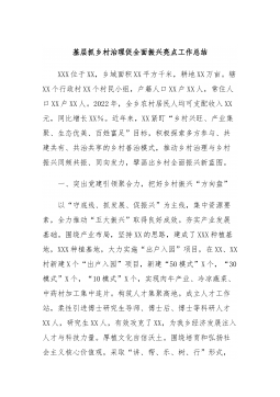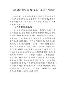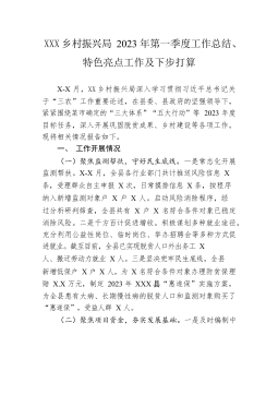 XXX乡村振兴局2023年第一季度工作总结、特色亮点工作及下步打算X-X月,XX乡村振兴局深入学习贯彻习近平总书记关于“三农”工作重要论述,在县委、县政府的坚强领导下,紧紧围绕某市确定的“三大体系”“五大行动”等2023年度目标任务,深入开展巩固脱贫成果、乡村建设等各项工作。现将相关情况报告如下。一、工作开展情况(一)聚焦监测帮扶,守好民生底线。一是常态化开展监测帮扶。X-X月,全县各行业部门共计推送风险信息X条,受理群众自主申报X次,日常摸排信息X条,按程序纳入新增监测对象户X户X人。启动风险消除程序,经过分析研判筛查,全县共有X户X名符合条件对象已稳定消除风险。二是千方百计促进增收。积极谋...