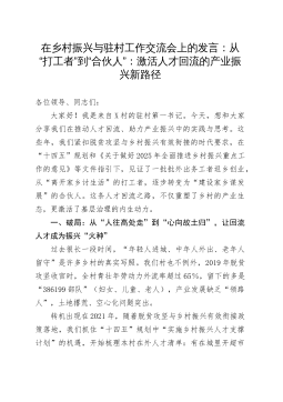 在乡村振兴与驻村工作交流会上的发言:从“打工者”到“合伙人”:激活人才回流的产业振兴新路径各位领导、同志们:大家好!我是来自X村的驻村第一书记。今天,想和大家分享我们在推动人才回流、助力产业振兴中的实践与思考。这些年,我们紧扣脱贫攻坚与乡村振兴有效衔接的时代要求,在“十四五”规划和《关于做好2025年全面推进乡村振兴重点工作的意见》等文件指引下,见证了一批批外出务工者返乡创业,从“离开家乡讨生活”的打工者,逐步转变为“建设家乡谋发展”的合伙人。这条人才回流之路,不仅重塑了乡村的产业生态,更激活了基层治理的内生动力。一、破局:从“人往高处走”到“心向故土归”,让回流人才成为振兴“火种”过去很长一...
