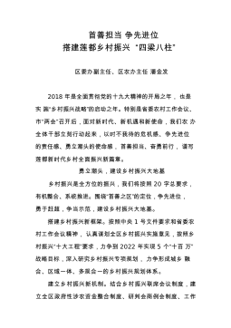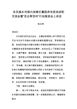 在实施乡村振兴战略打赢脱贫攻坚战述职交流会暨“百企帮百村”行动推进会上讲话张占林同志们:今天我们召开这次会议,主要任务是深入学习贯彻习近平总书记关于实施乡村振兴战略的重要论述,贯彻落实全国、自治区实施乡村振兴战略工作推进会精神和全市乡村振兴暨脱贫攻坚现场推进会精神,动员全区上下积极行动起来,以更严要求、更实举措、更大力度,鼓足干劲推进乡村振兴,坚定信心打好脱贫攻坚战,切实组织实施好“百企帮百村”行动,推动东胜“三农”工作全面振兴、全面进步。刚才,罕台镇、泊江海子镇折家梁村、巴音敖包村驻村工作队和久科康瑞环保科技有限公司的4位代表作了交流发言,大家讲做法、谈思路,讲得很好,思路清晰,举措务实。各...
