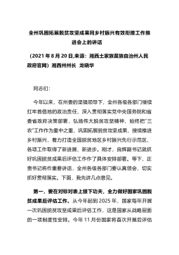 全州巩固拓展脱贫攻坚成果同乡村振兴有效衔接工作推进会上的讲话 (2021年8月20日,来源:湘西土家族苗族自治州人民政府官网)湘西州州长 龙晓华 同志们:今年以来,在州委的坚强领导下,全州各级各部门继续扛牢首倡地的政治责任,深入贯彻落实党中央国务院和省委省政府决策部署,弘扬伟大脱贫攻坚精神,始终把“三农”工作作为重中之重,巩固拓展脱贫攻坚成果,接续推进乡村振兴,着力打造全国脱贫地区乡村振兴先行示范区,各项工作取得了新进展、新进步。刚才,良辉副书记就抓好巩固脱贫成果后评估工作作了具体安排部署。等下,正贵书记将作重要讲话,全州各级各部门要认真领会,切实抓好贯彻落实。下面,我先讲几点意见。 ...